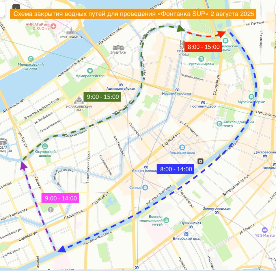 Из-за перекрытия рек и каналов для проведения фестиваля Фонтанка-SUP 02.08.2025 рейсы в 11.00, 12.00, 13.00 отменяются. Первый рейс отправляется в 14.00 и проводится по измененному маршруту: река Фонтанка-Нева-Река-Фонтанка. С 15.00 и далее рейсы проводится по обычному маршруту.